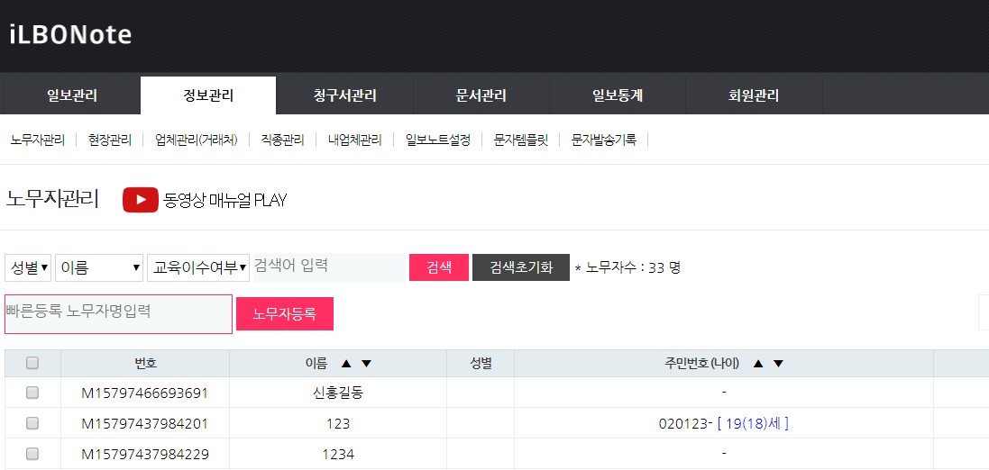 1. 노무자 등록