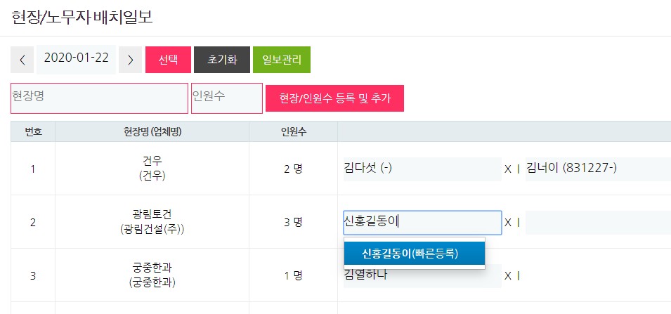 1. 현장/노무자 배치일보에서도 동일하게 위 기능이 적용되었습니다.