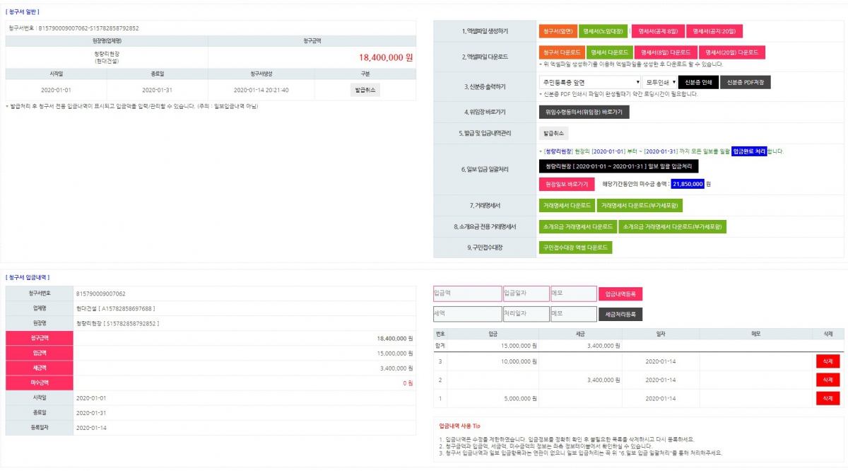 일보를 등록하기 위해 시행했던 노무자등록, 거래처등록, 현장등록의 과정없이