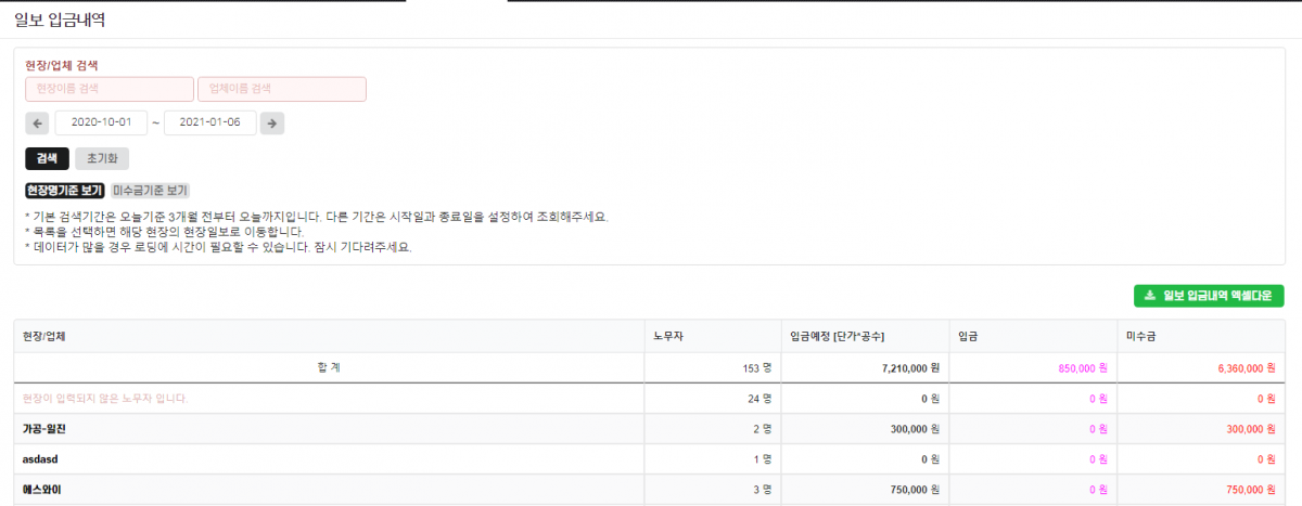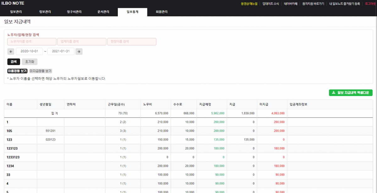 노임대장 - 노무자계좌정보 포함 문서 추가, 일보입금내역 엑셀다운로드, 일보지급내역 엑셀다운로드 기능추가 업데이트