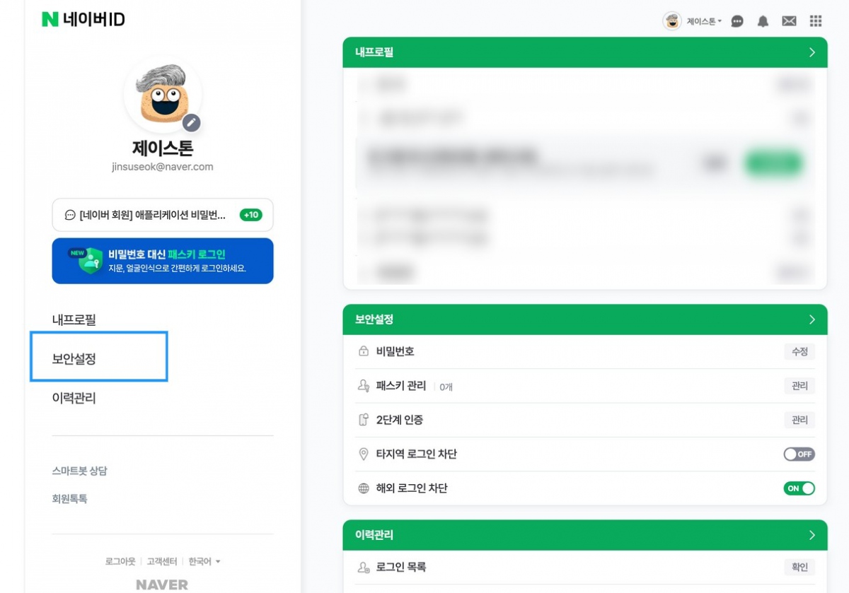 - 네이버ID 화면 좌측 메뉴 중 '보안설정' 을 클릭합니다.