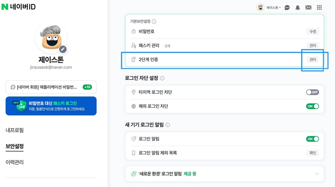 - 오른쪽 화면에서 '2단계 인증' 의 관리 버튼을 클릭합니다.