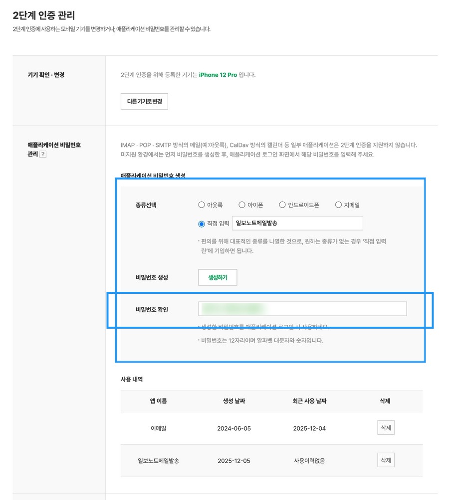 - 어플리케이션 비밀번호 관리 부분에서 "종류 선택"을 직접 입력으로 하고 "일보노트"라고 입력합니다.
