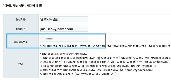 - 일보노트 [정보관리 - 일보노트 설정] 메뉴의 "이메일 발송 설정 : 네이버 메일" 부분에서